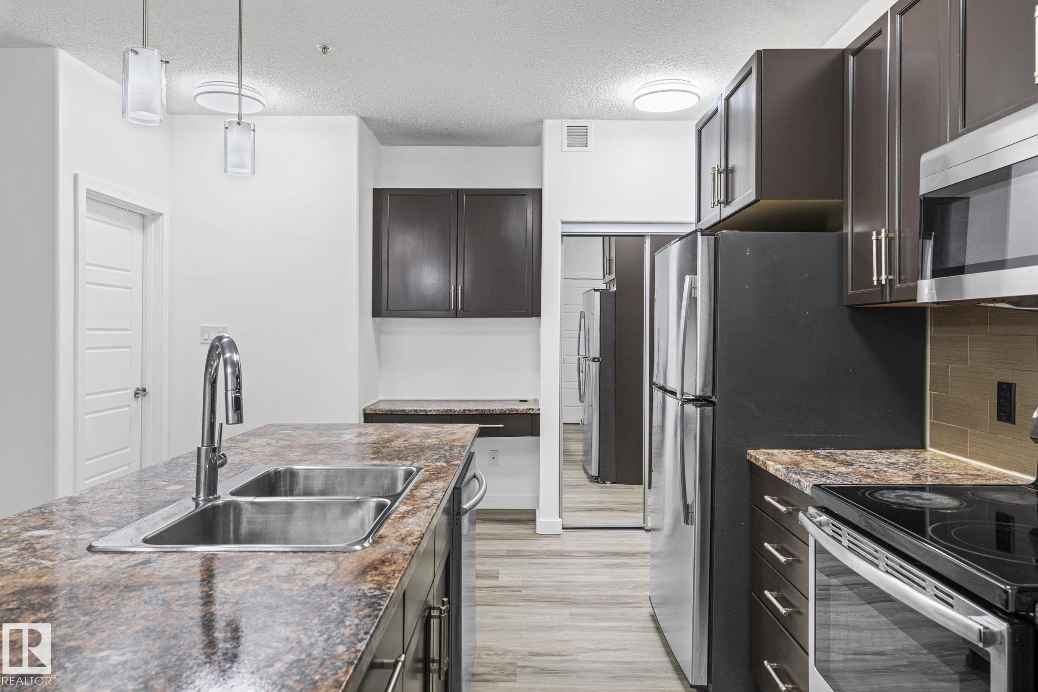 Welcome to this fully renovated 2 bed, 2 bath condo in sought-after Ambleside, Windermere area! This main floor unit offers 850 sq ft of open-concept living with brand new flooring, fresh paint, and modern lighting. Bright and functional layout with spacious living area, private balcony, and in-suite laundry. Primary bedroom features a walk-through closet and 3pc ensuite. Second bedroom and full bath ideal for guests or home office. Low condo fees, titled underground parking, and pet friendly building. Enjoy building amenities including a gym, guest suite, and social room. Close to Currents of Windermere, shopping, restaurants, parks, and Anthony Henday. Move-in ready!