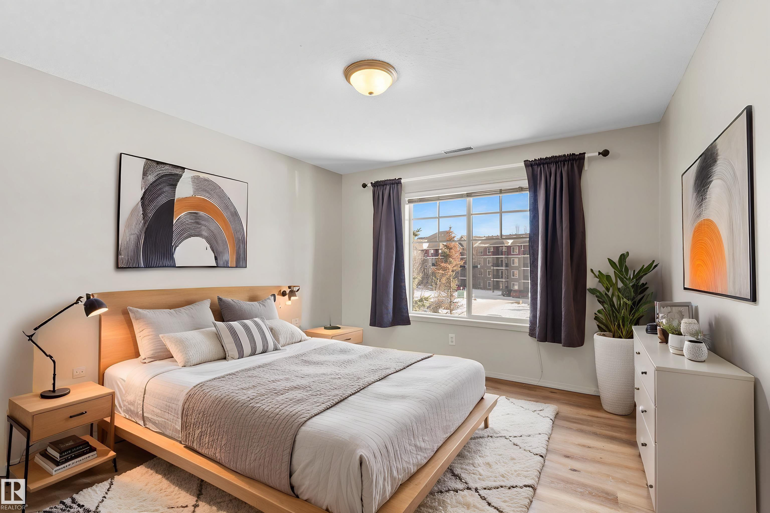 Rare opportunity to own this pet-friendly condo! Spacious 2 bed, 2 FULL bath condo with a generous 1,133 sq ft layout on the desirable THIRD floor, featuring quiet east-facing COURTYARD VIEW -- NOT street facing. Super WELL-MAINTAINED with a bright and functional layout. The spacious kitchen features a central island, beautiful maple cabinetry, and a ceramic tile backsplash. The open living and dining area provides plenty of space for relaxing or entertaining. Step onto the peaceful east-facing balcony with a gas BBQ hookup, perfect for morning coffee and comfortable evening grilling away from the hot afternoon sun. The large primary bedroom features mirrored his-and-hers closets and a full 4-pc ensuite. Includes in-suite laundry, underground heated parking, storage, and access to a fitness room, guest suite, and social/party room. Conveniently located close to shopping, restaurants, and everyday amenities. Some photos are virtually staged.