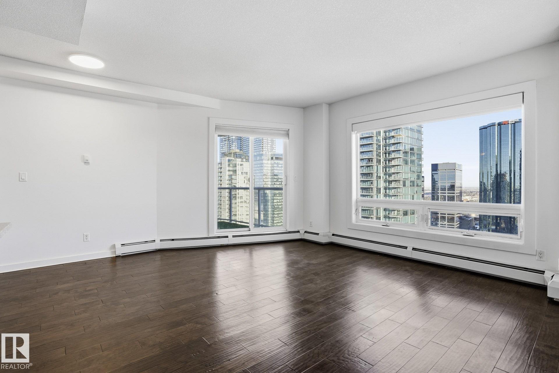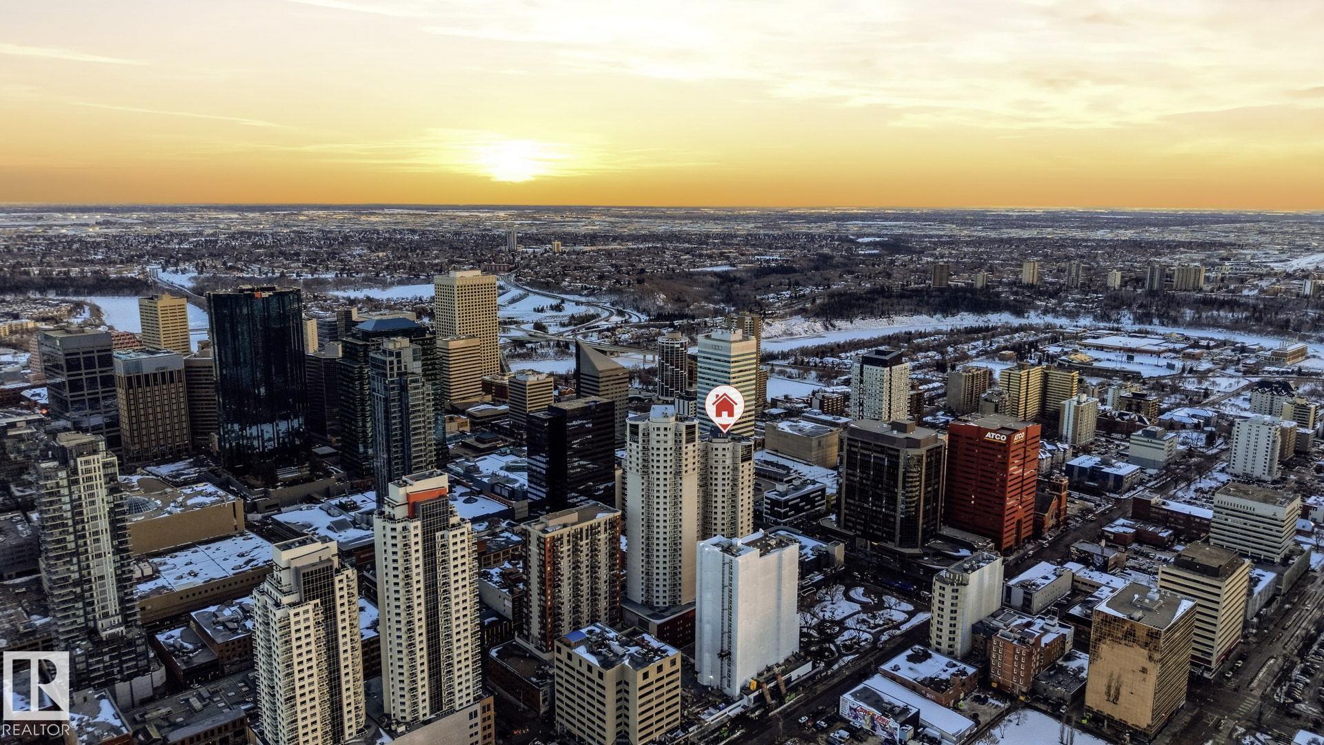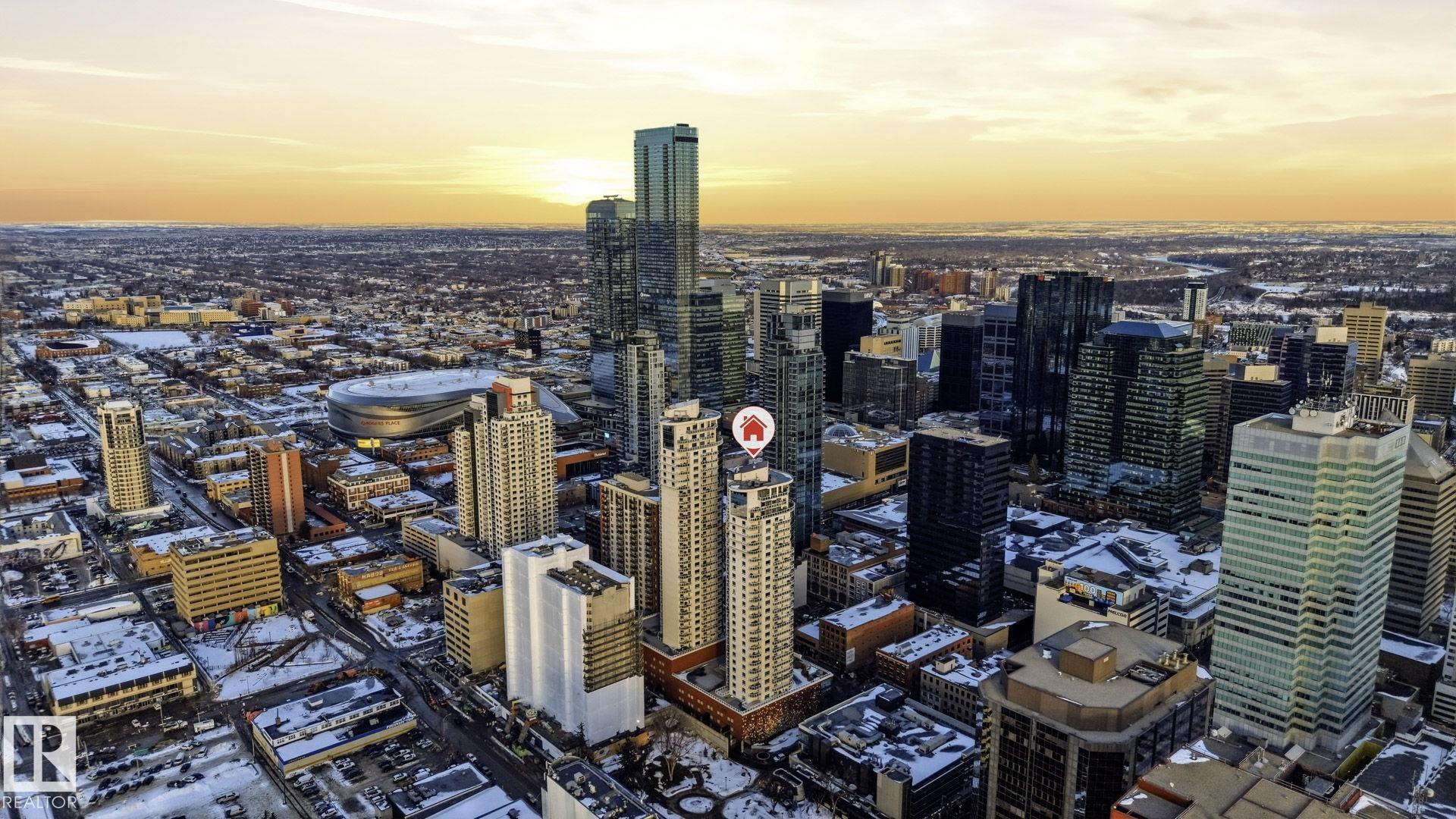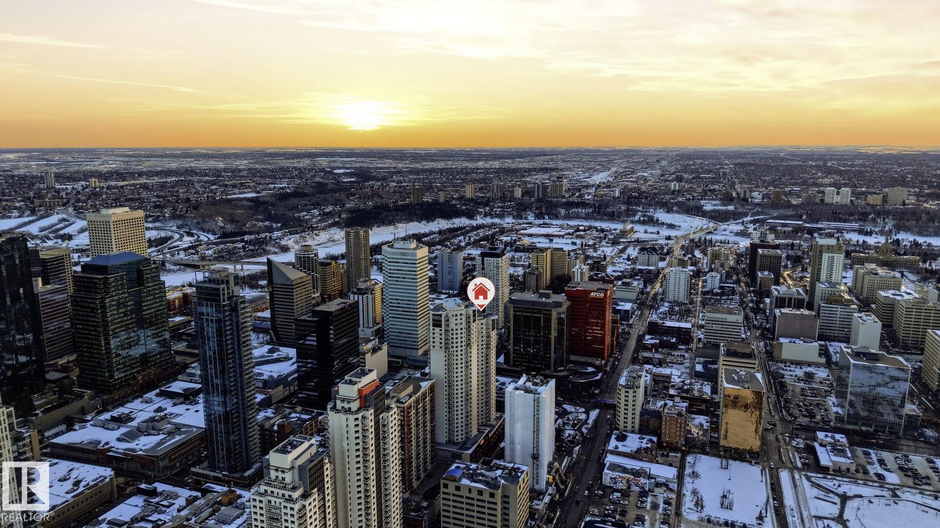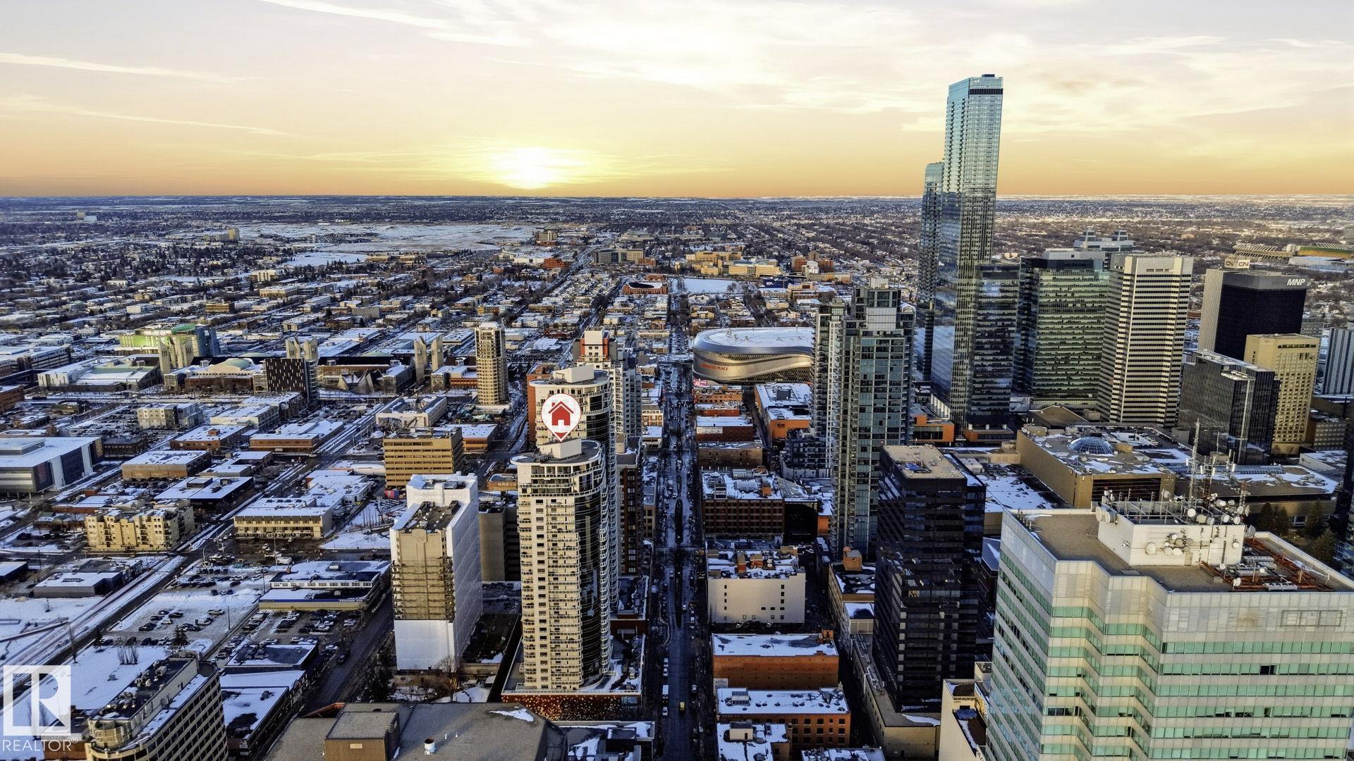Live in the heart of downtown in this stunning 27th-floor condo in Icon II, offering incredible Downtown, NE, and SE River Valley views. This highly functional 2 bedroom, 2 bath features 098SqFt of spacious living with contemporary finishes throughout, including engineered hardwood, tile flooring, granite countertops, sleek cabinetry, upgraded fixtures & fresh paint. The open-concept kitchen is equipped with stainless steel appliances & a breakfast bar overlooking the spacious great room with dining nook & access to the balcony showcasing breathtaking views. The primary bedroom features a walk-in closet & 4 piece ensuite, while the large 2nd bedroom offers ample closet space. Enjoy in-suite laundry, plenty of storage, and secure heated underground parking, plus heated visitor parking. Unbeatable downtown location on one of Edmonton's best streets--steps to markets, dining, Ice District/Rogers Place, MacEwan, River Valley trails LRT, & minutes to the U of A and NAIT. Urban living at its finest!