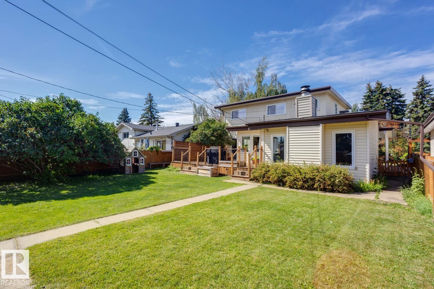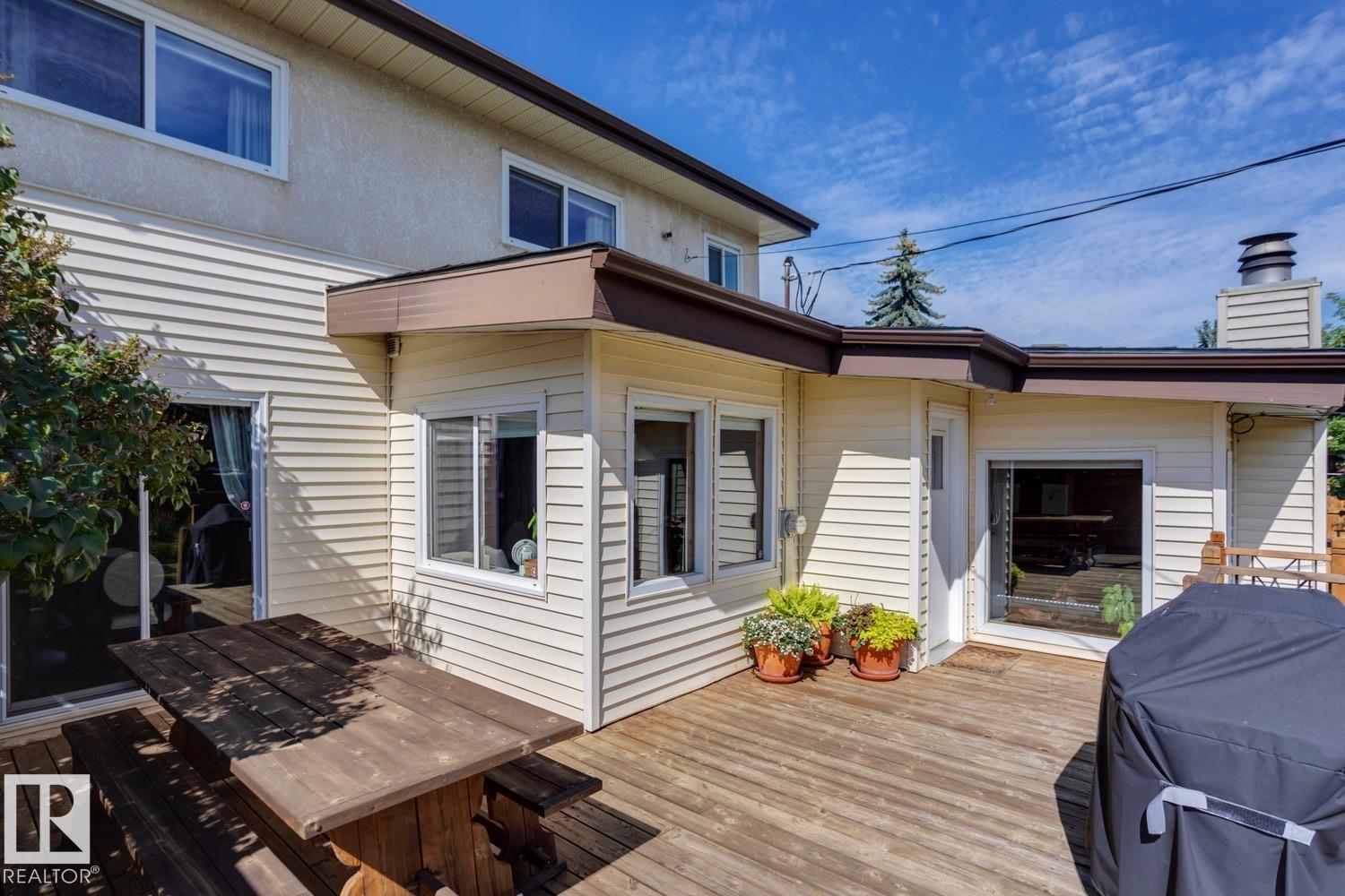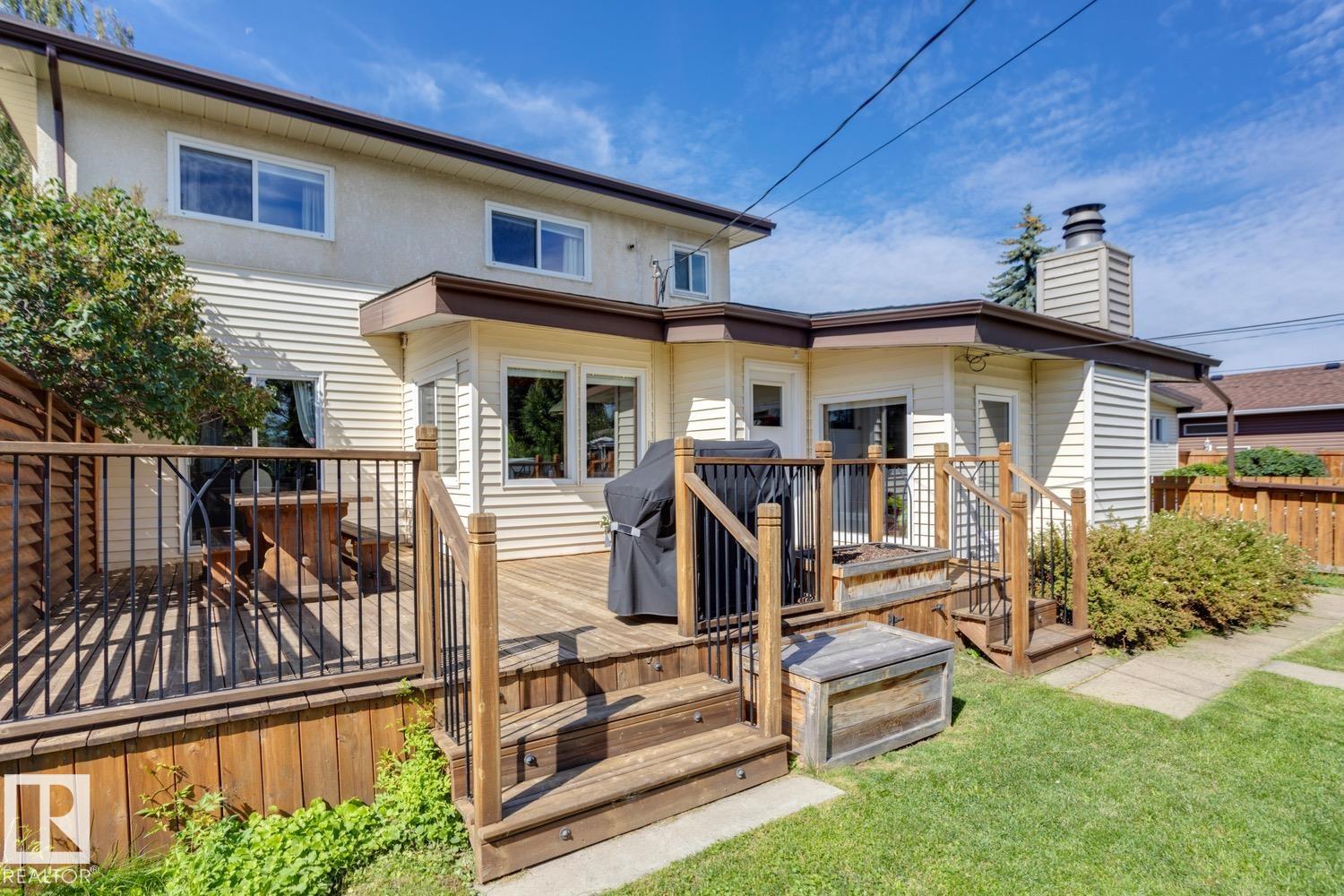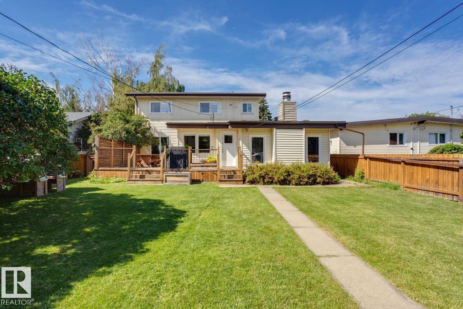 Awesome family home in the desirable community of Malmo! This unique 2-storey is located on a very quiet street, sits upon a beautiful 6000 sqft lot, offers over 2400 sqft of living space, 4 total bedrooms, and has been tastefully updated! The main floor features a spacious floor plan, great kitchen w/s.s. appliances, breakfast nook, formal living/dining areas w/hardwood floors and lavish fireplace. Gorgeous family area w/vaulted ceiling, extensive wood features, and additional fireplace. Upstairs you will find the four good sized bedrooms and full bath. The fully finished lower level offers a great rec area and plenty of storage space. Outside you will enjoy the very private yard, huge deck, and mature landscaping. Other features of the home include: new furnace/HWT, newer roof, some new windows, new fence, renovated bathrooms, flooring, paint, fixtures, and more! Located steps to great schools, public transit, Southgate mall, and minutes to the University of Alberta. Great opportunity in a great area!