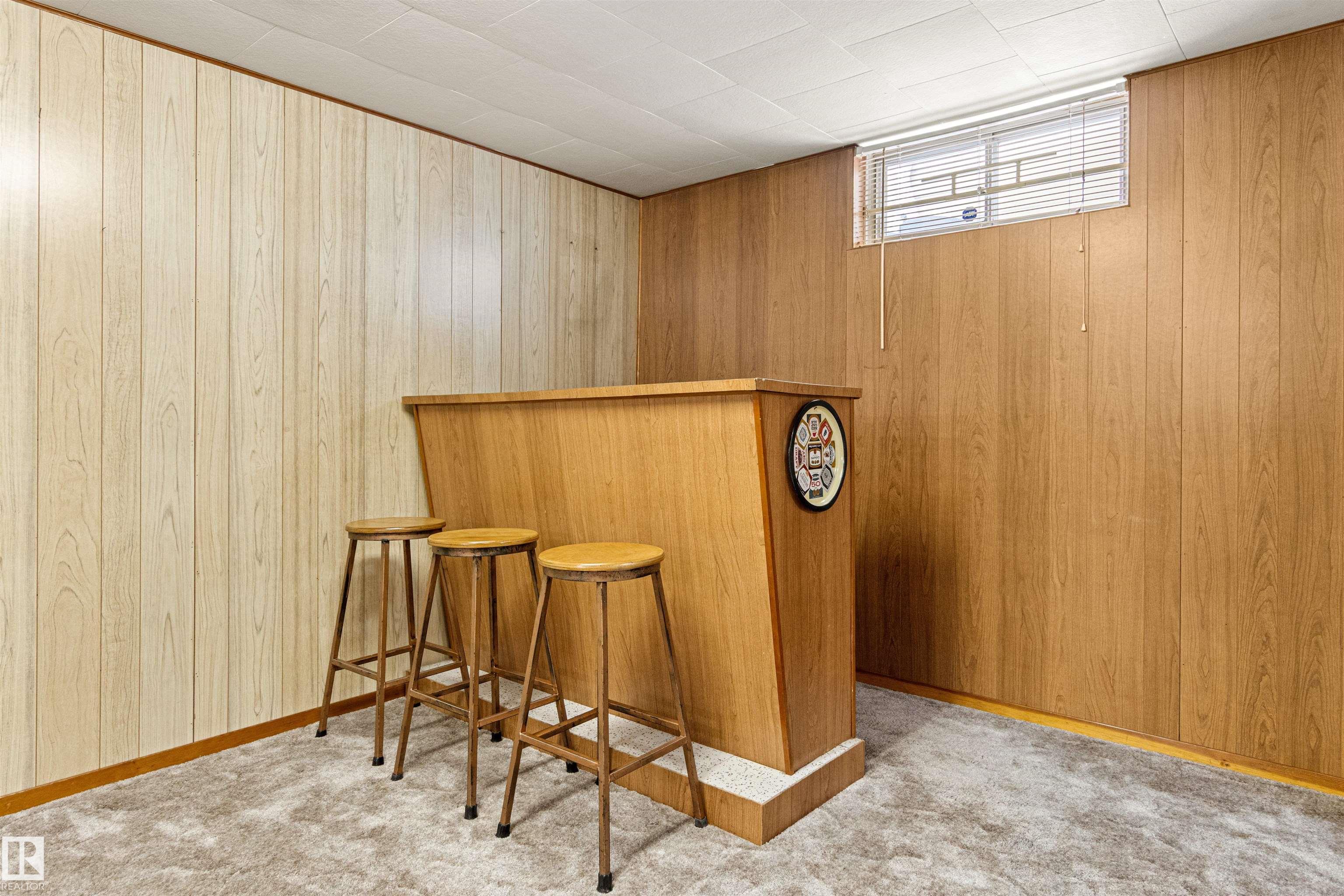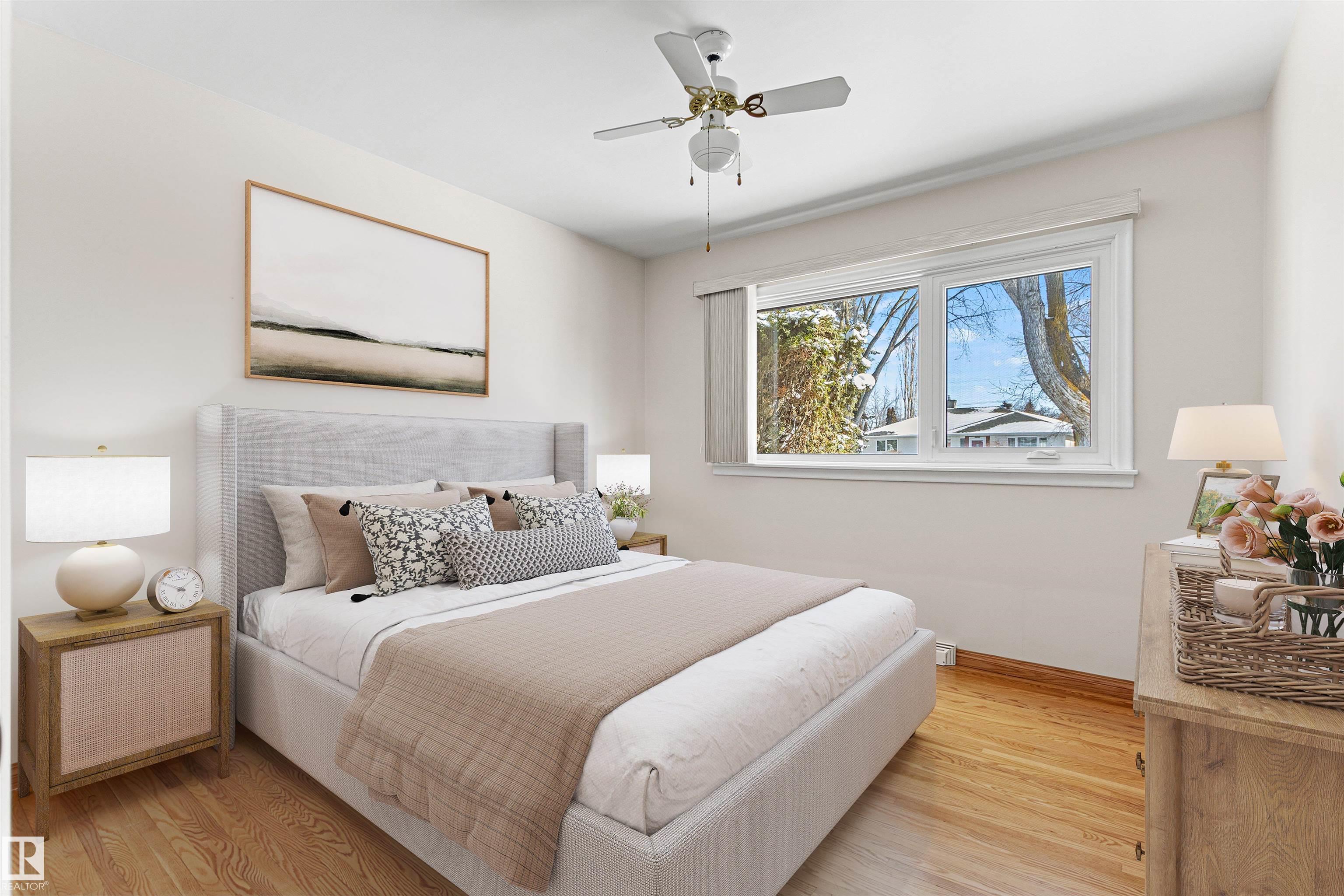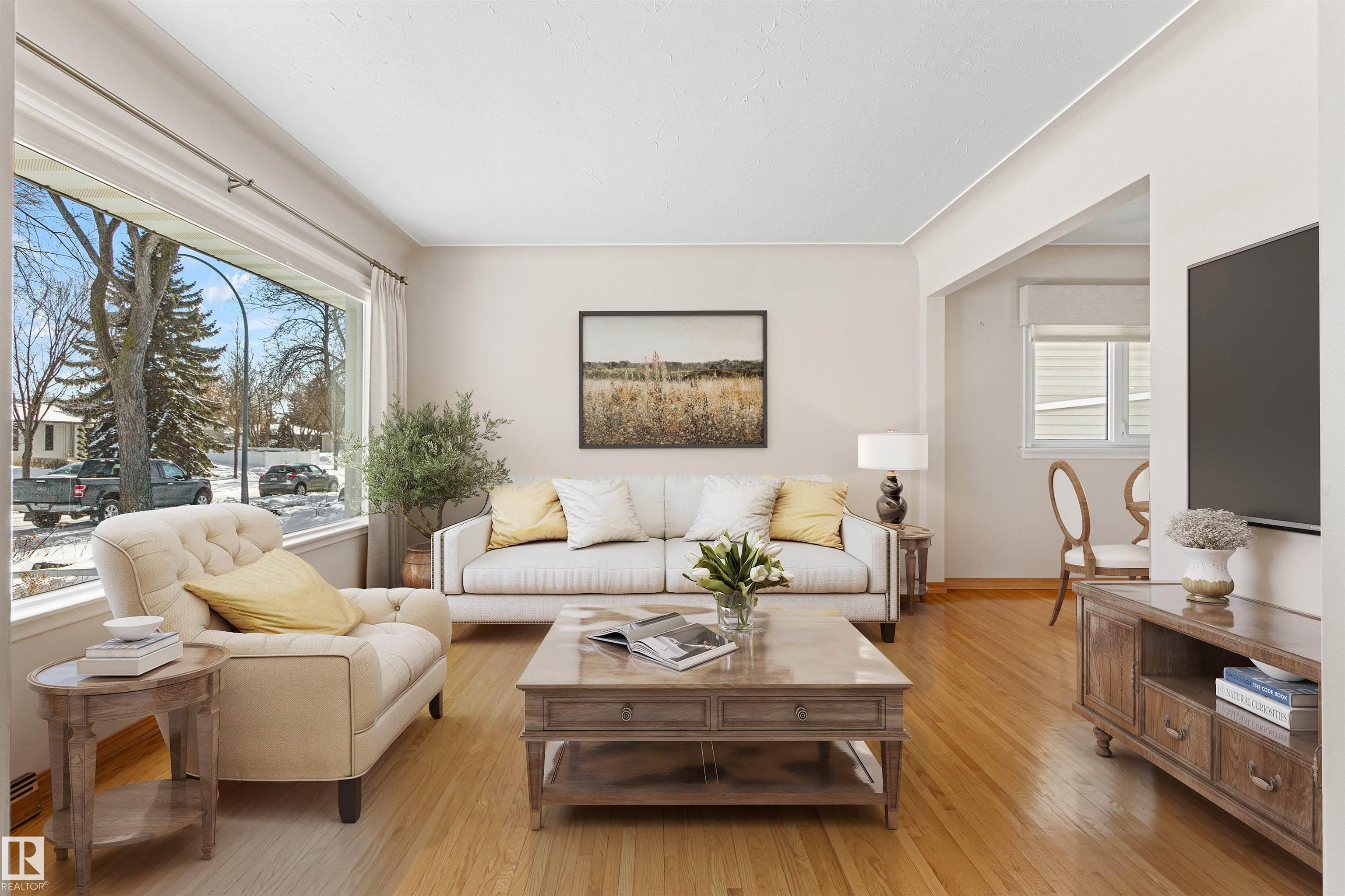 Solid McQueen bungalow has been enjoyed and lovingly cared for by the same family since 1962. Situated on a tree lined street, private West back yard, underground sprinkler front/back, detached heated oversized double garage (23'9"X26'9") and RV parking. Garage has 10' ceiling, 220V, 18' overhead door, car wash, floor drain, steel beam w hoist, wall of cabinets and plenty of space for a work shop. This lovely home has charm and character with original hardwood floors & coved ceiling. Main floor has 3 bedrooms, upgraded 4 piece bath, spacious living rm, formal dining rm with built in cabinet, well designed kitchen with solid wood cabinets and breakfast nook. Basement has large family rm with wall unit & bar, 4th bedroom, 3 piece bath, cold rm, laundry/utility rm & storage. Walking distance to all levels of schools including Thrive Elementary and Archbishop MacDonald. Quick commute to Downtown, Groat Road, Yellowhead Trail and Whitemud Drive. Family friendly neighbourhood close to all amenitities.