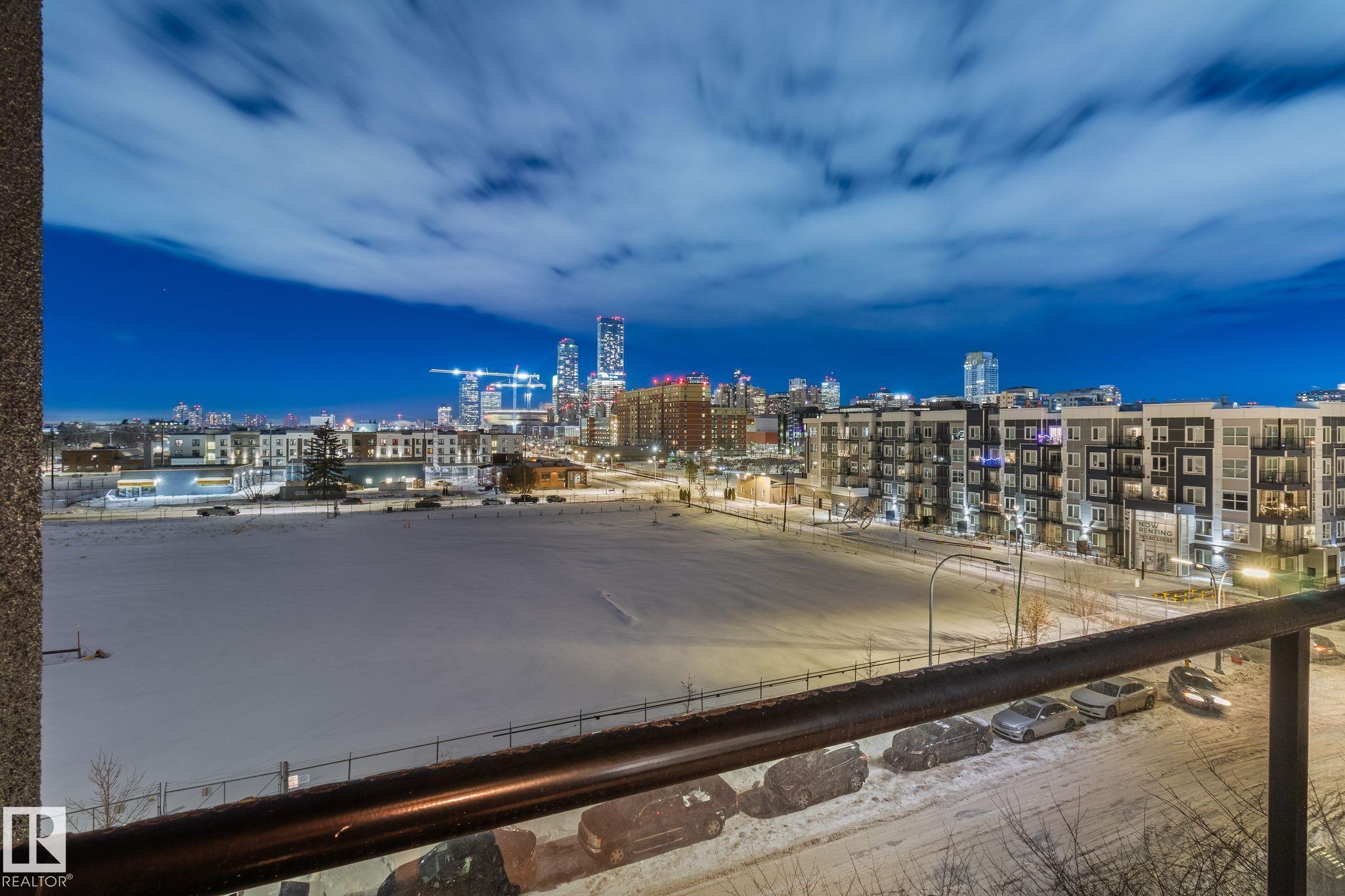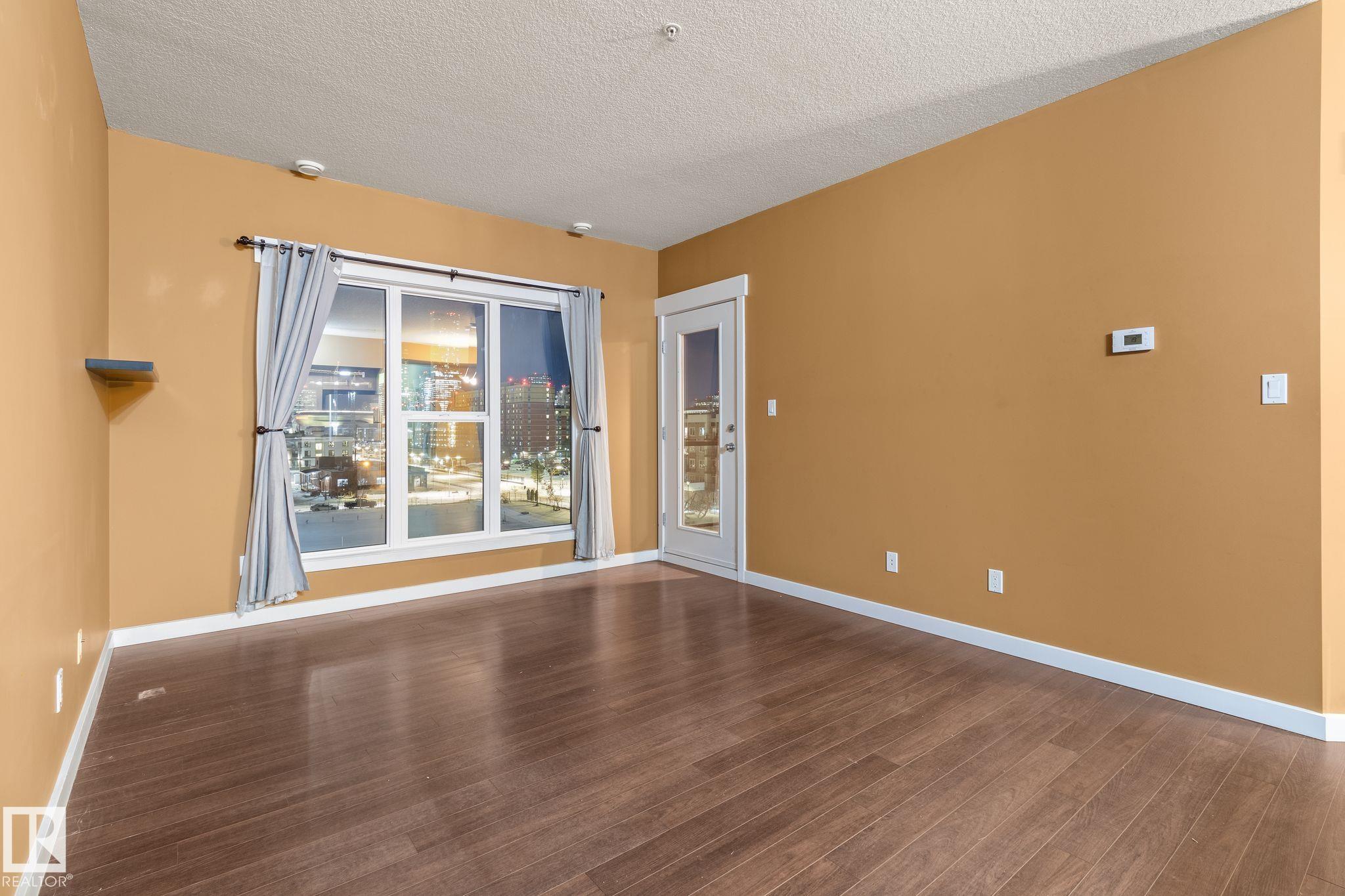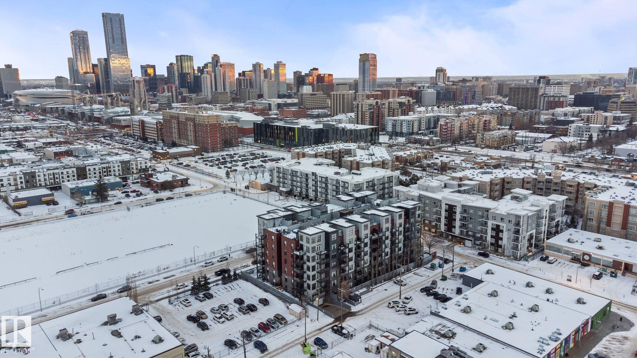 Minutes to downtown and close to Edmonton's best restaurants, shopping, and nightlife, this 790 sq ft condo nails the "easy city living" vibe. Tall ceilings and an open layout make the space feel bright and airy, while large windows bring in tons of natural light. The kitchen is the centerpiece with granite counters, a big island for prep and hosting, and stainless steel appliances. Wood style flooring keeps it clean and durable. The primary bedroom easily fits a king bed and includes a private dressing area that leads into a modern ensuite with a glass shower. A second room gives you options as a home office, guest space, or flex room. You also get a second full bathroom, in suite laundry, and air conditioning for summer comfort. Step outside to an oversized balcony with a gas line for your BBQ and plenty of room for patio furniture, perfect for summer evenings. Complete the package with underground parking for secure, year round convenience.