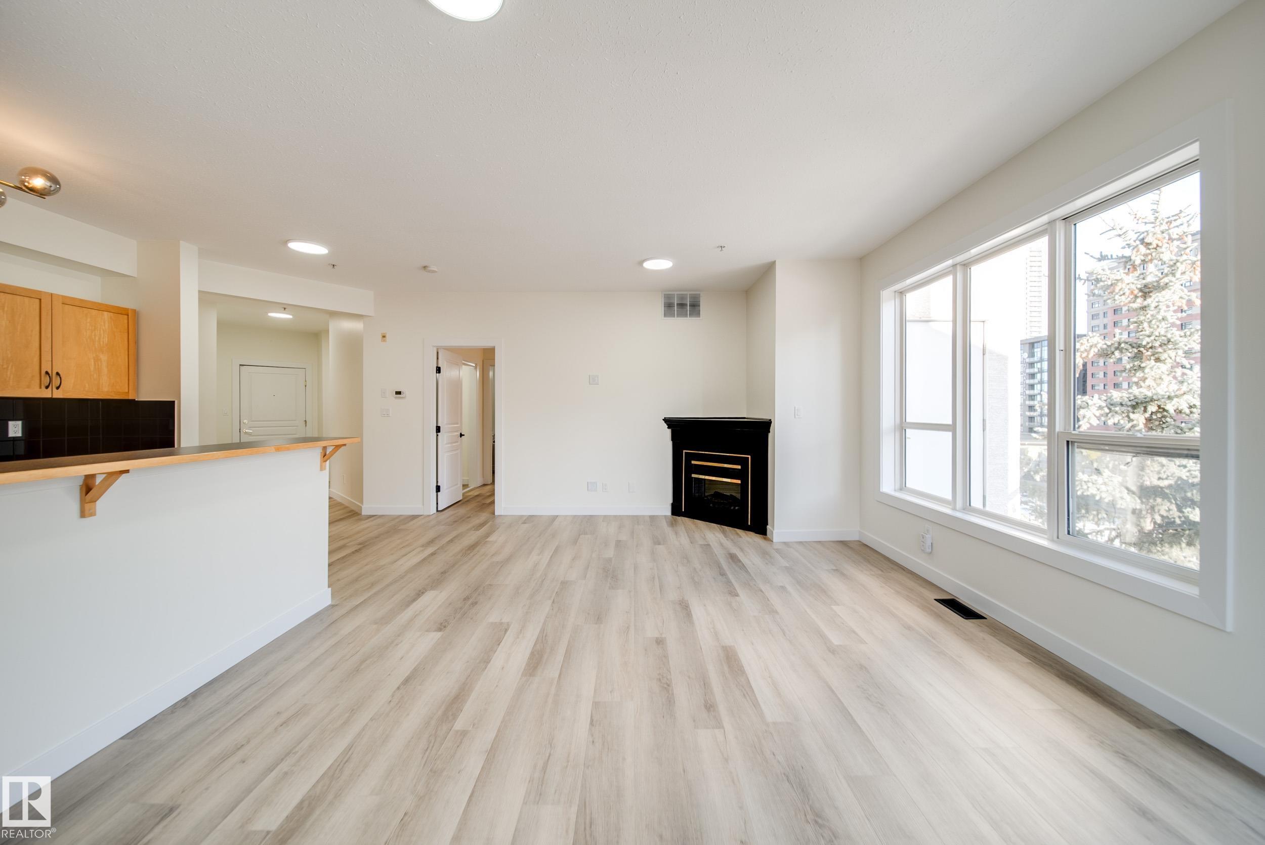 Enjoy the best of downtown living w/space & style to match,in this RENOVATED 2 bed 2 bath PENTHOUSE CORNER unit. Tucked into a sought after building just steps off Jasper Ave, w/easy access to Rogers Place, MacEwan, River Valley, LRT, & everyday amenities. Thoughtfully updated w/new LUXURY VINYL PLANK flooring, fresh paint, new baseboards, trim, window casings, light fixtures, hardware, & brand new appliances, it's truly move in ready. A bright & welcoming open concept living space is anchored by a corner GAS fireplace and surrounded by windows inviting in natural light. The kitchen offers generous counter space & a breakfast bar, making it perfect for entertaining or relaxed evenings at home. Take in beautiful sunrises off your east facing patio w/natural gas hookup. The primary suite hosts a LARGE W.I.C. & private 4pc ensuite, while the 2nd bedrm sits next to a full 3pc bath. In-suite laundry, AC, & 2 titled HEATED, UNDERGROUND tandem stalls complete the package. Turn key and ready for you to call home!