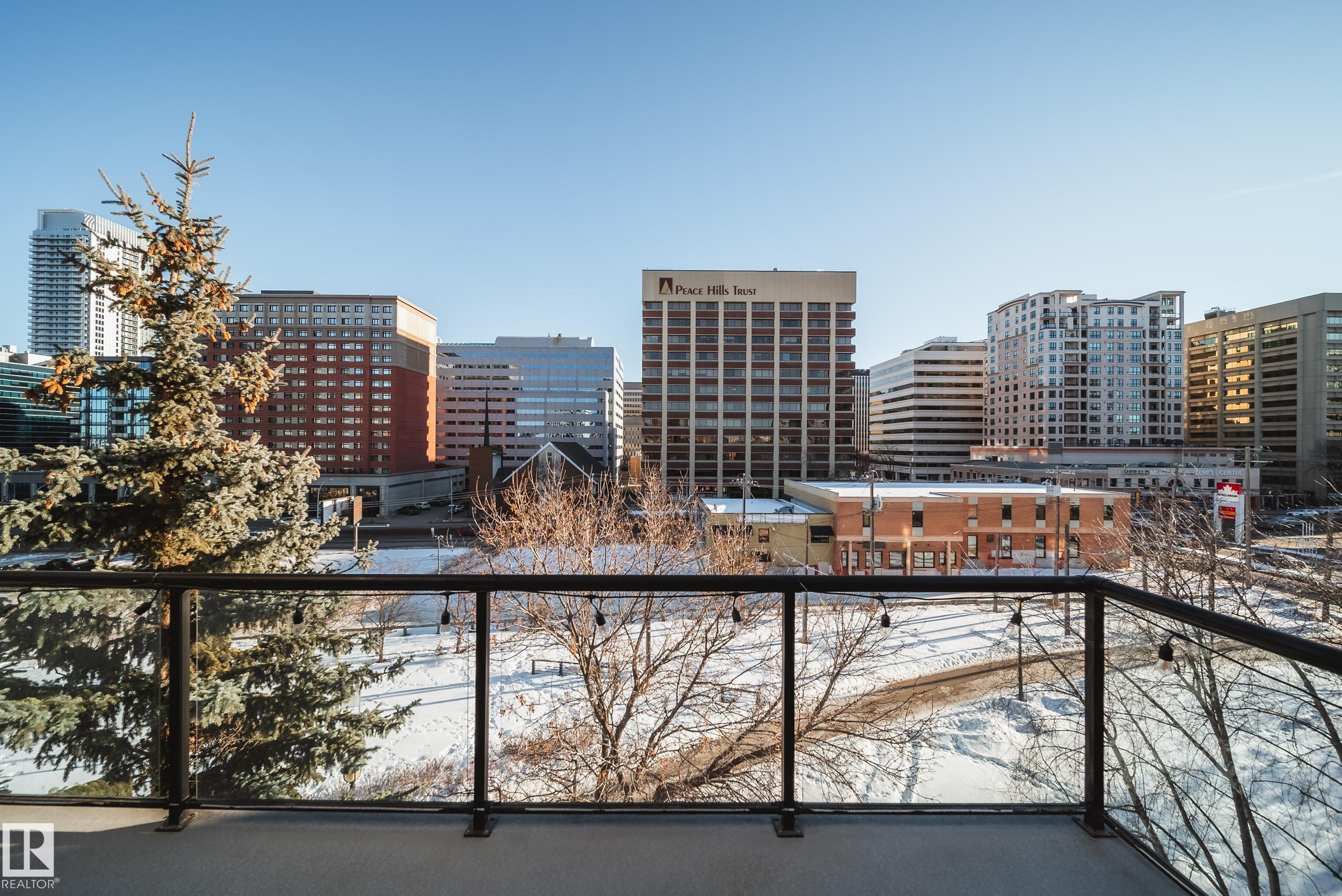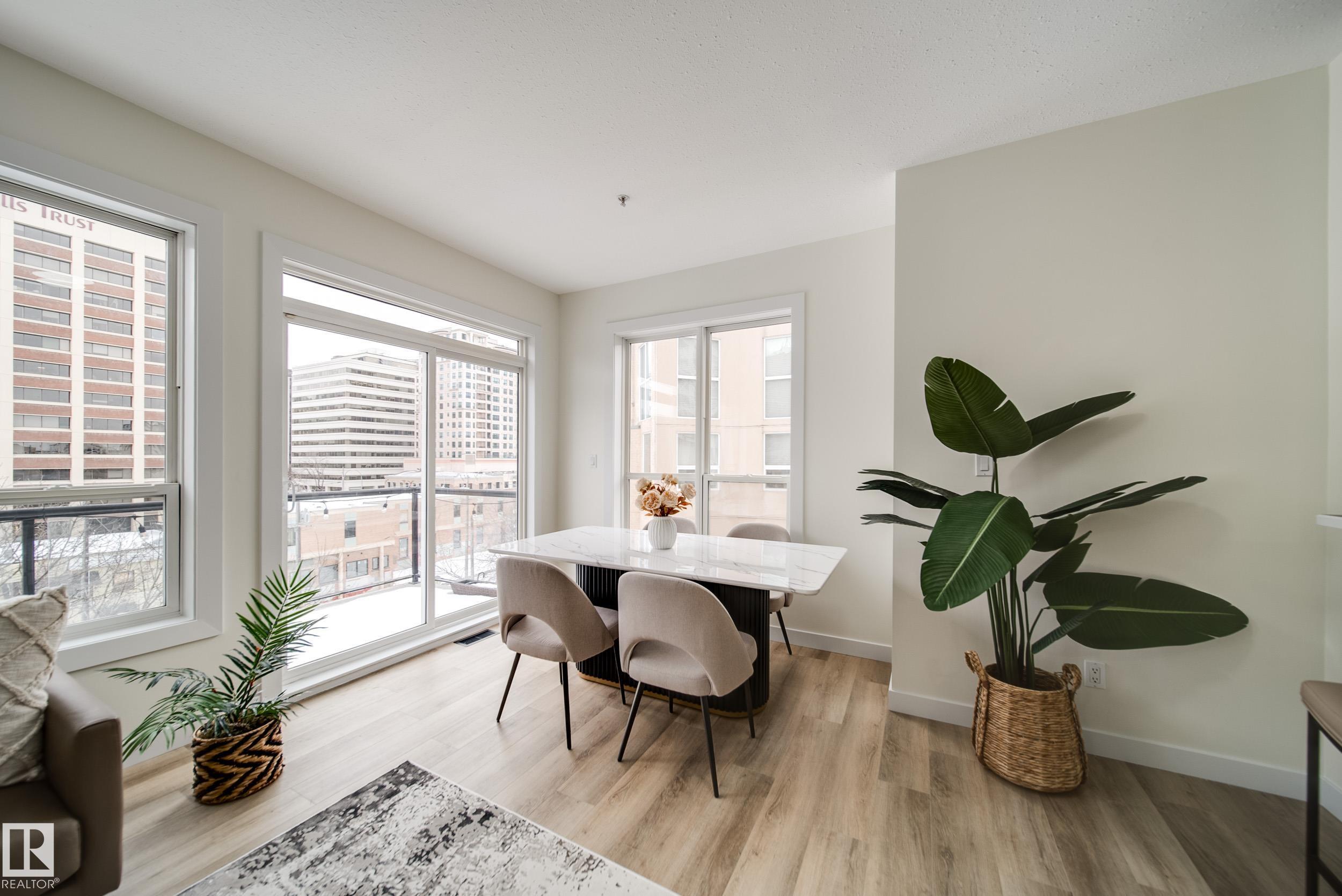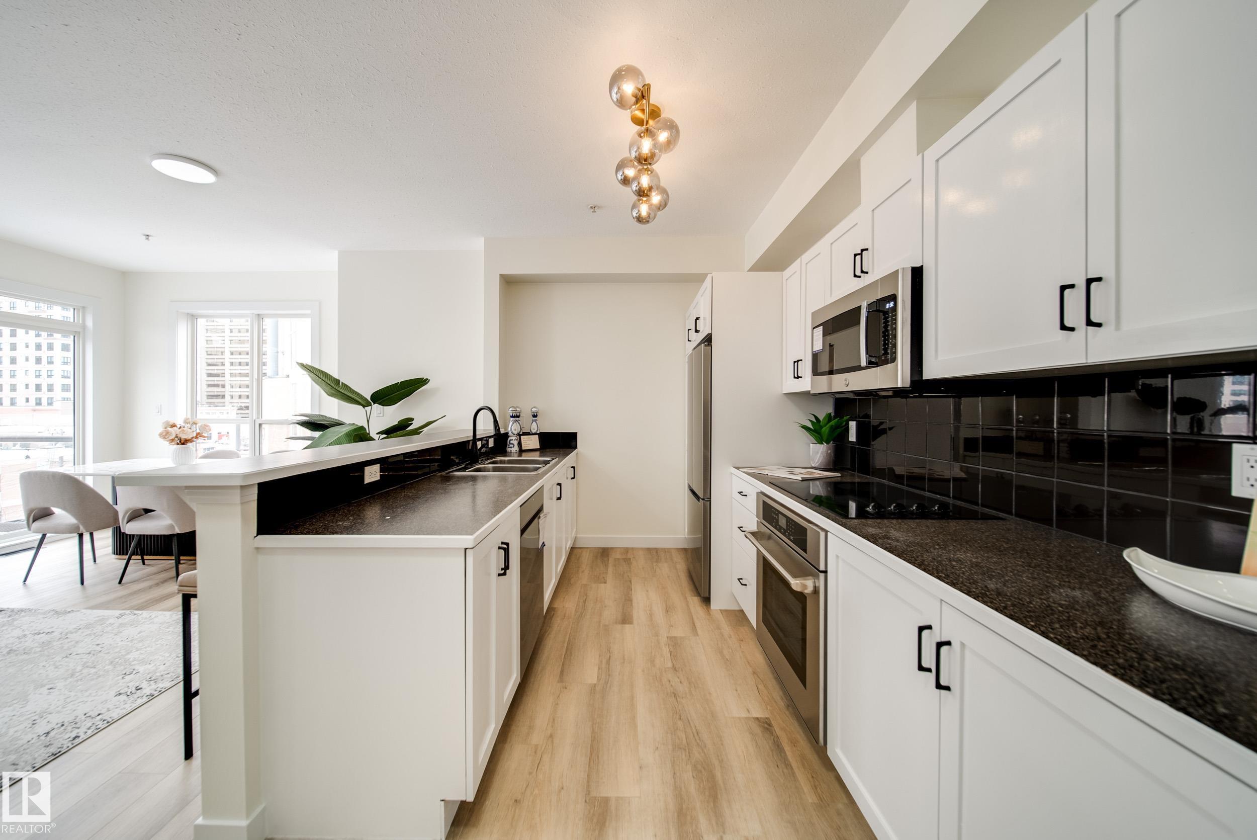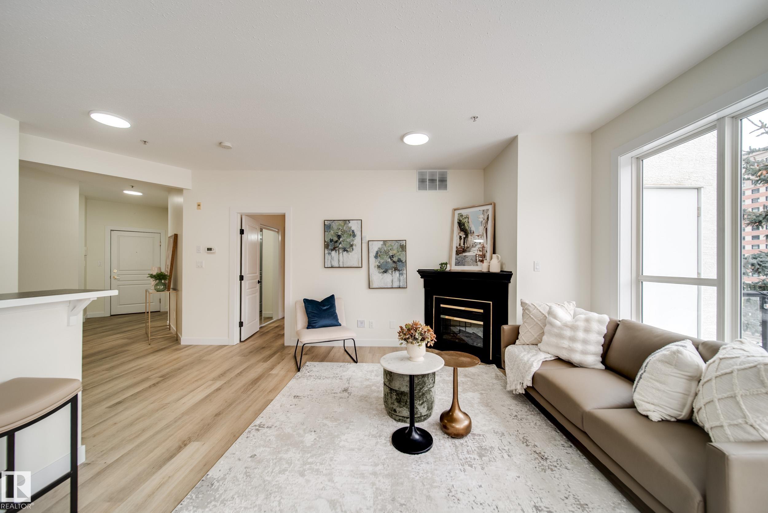 Enjoy the best of downtown living w/space & style to match,in this RENOVATED 2 bed 2 bath PENTHOUSE CORNER unit. Tucked into a sought after building just steps off Jasper Ave, w/easy access to Rogers Place, MacEwan, River Valley, LRT, & everyday amenities. Thoughtfully updated w/new LUXURY VINYL PLANK flooring, fresh paint, new baseboards, trim, window casings, light fixtures, hardware, & brand new appliances, it's truly move in ready. A bright & welcoming open concept living space is anchored by a corner GAS fireplace and surrounded by windows inviting in natural light. The kitchen offers generous counter space & a breakfast bar, making it perfect for entertaining or relaxed evenings at home. Take in beautiful sunrises off your east facing patio w/natural gas hookup. The primary suite hosts a LARGE W.I.C. & private 4pc ensuite, while the 2nd bedrm sits next to a full 3pc bath. In-suite laundry, AC, & 2 titled HEATED, UNDERGROUND tandem stalls complete the package. Turn key and ready for you to call home!