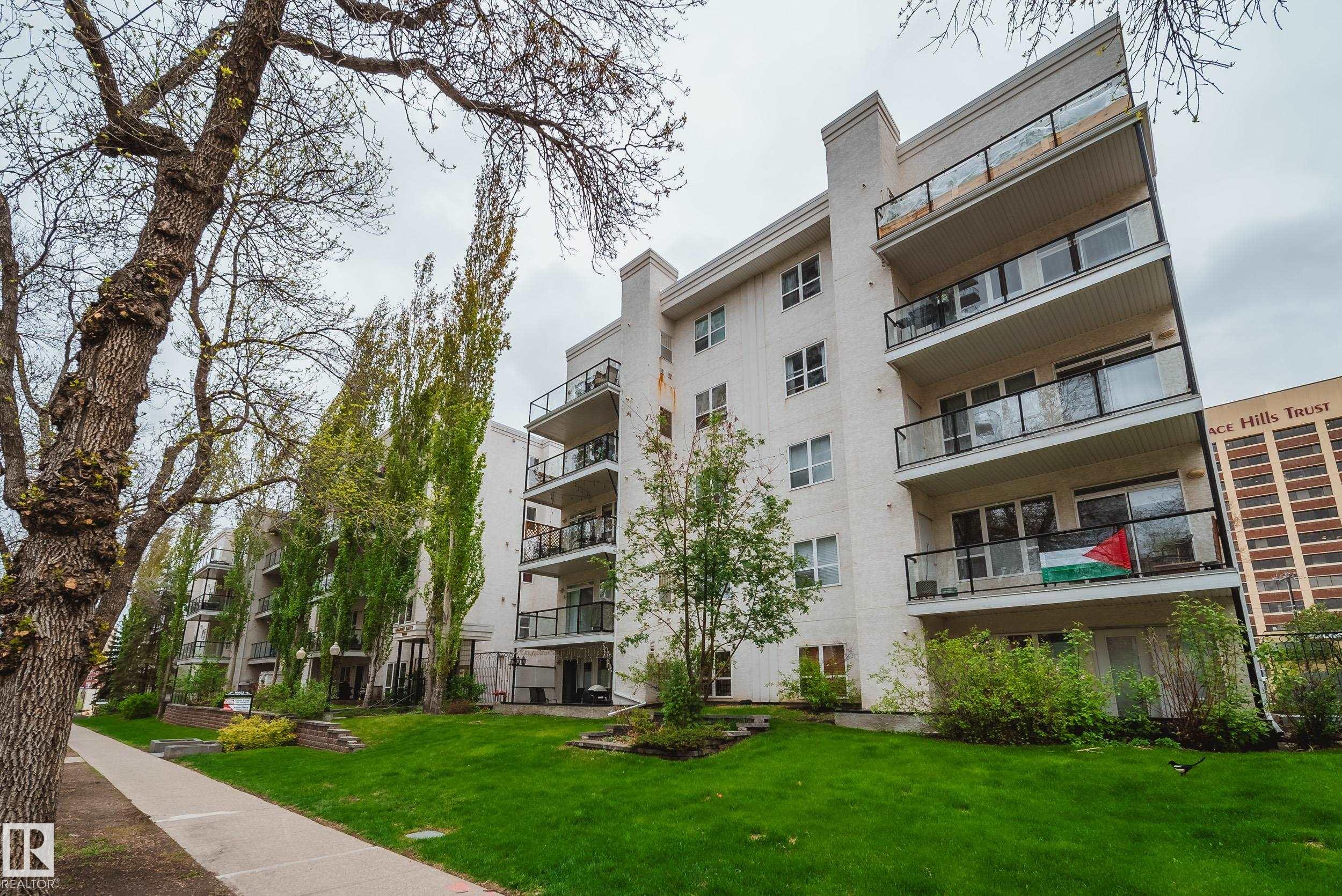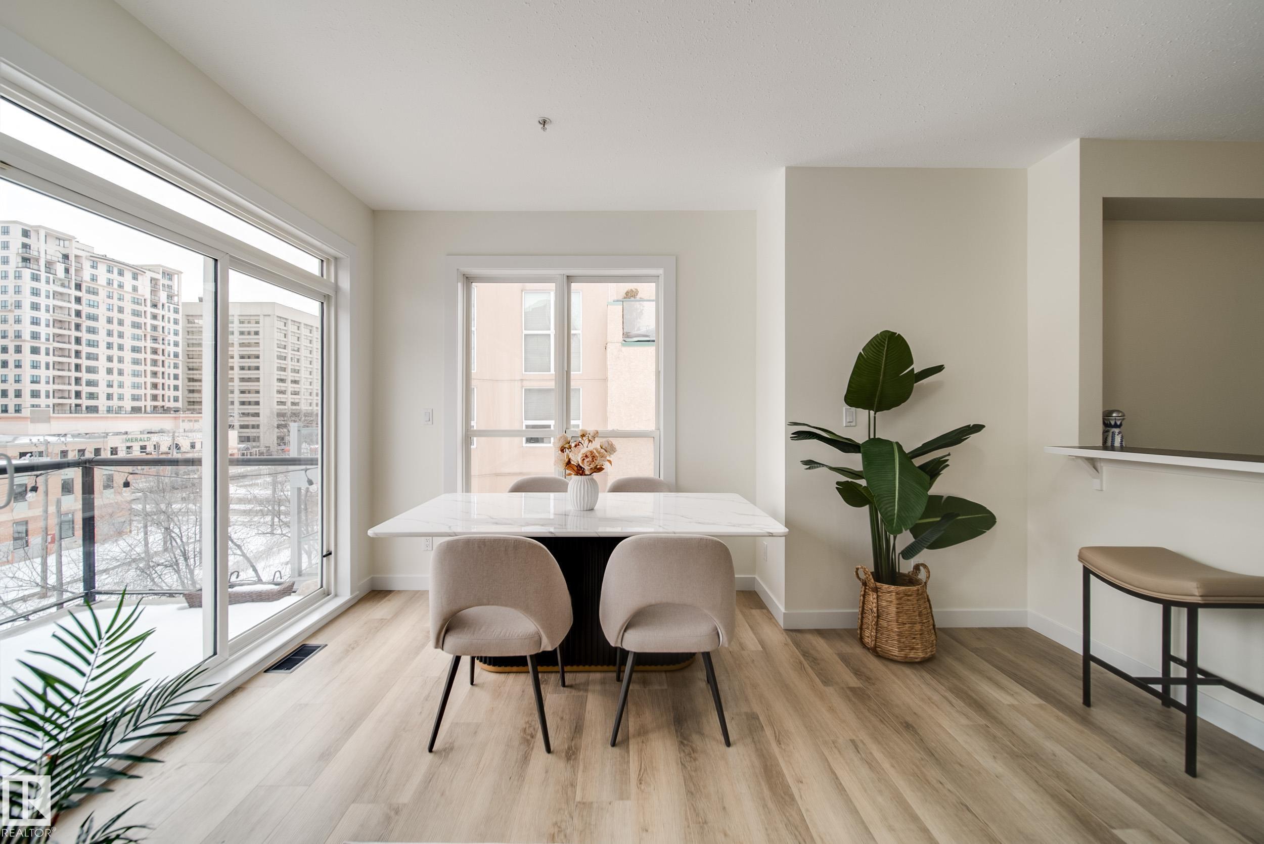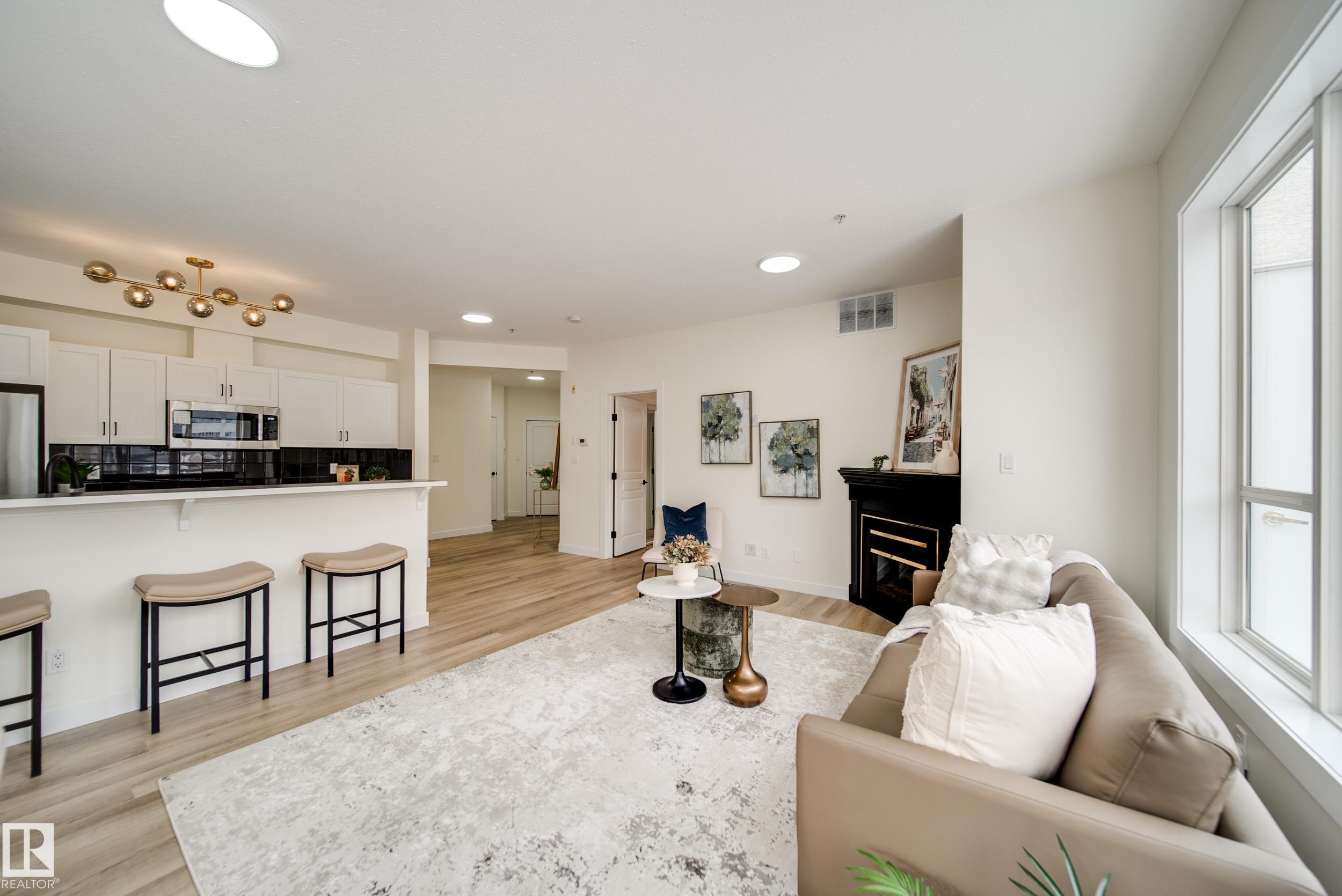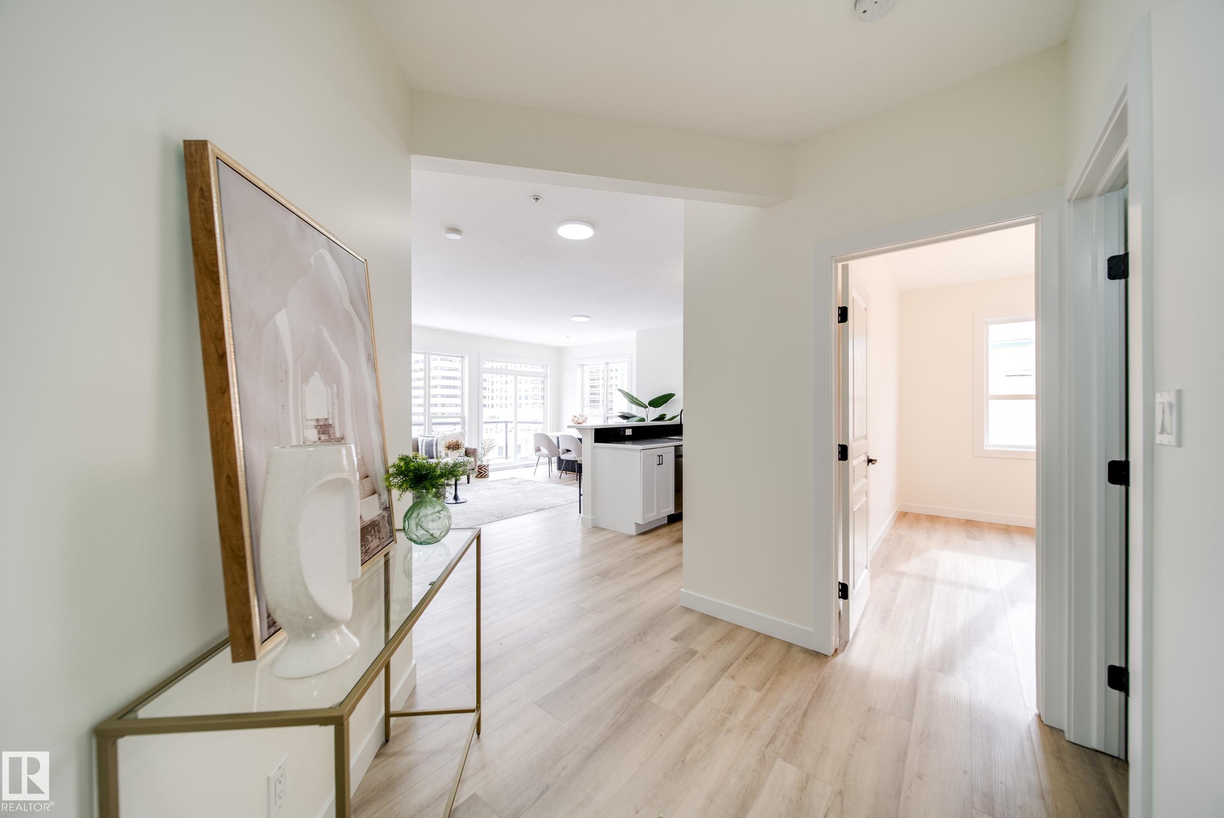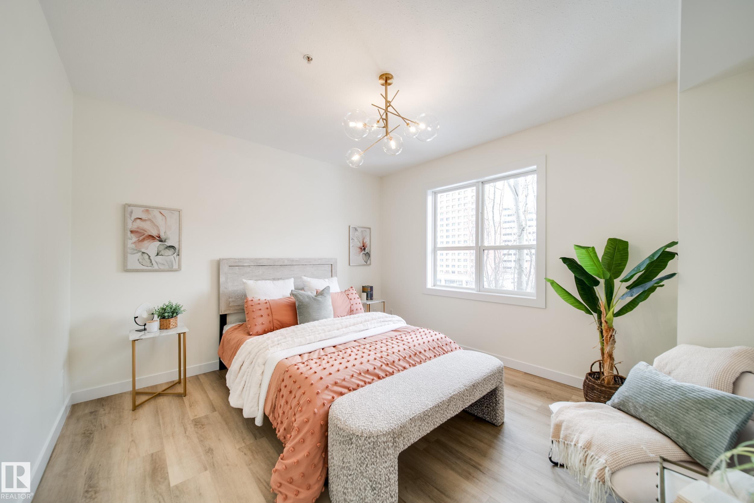 Enjoy the best of downtown living w/space & style to match,in this RENOVATED 2 bed 2 bath PENTHOUSE CORNER unit. Tucked into a sought after building just steps off Jasper Ave, w/easy access to Rogers Place, MacEwan, River Valley, LRT, & everyday amenities. Thoughtfully updated w/new LUXURY VINYL PLANK flooring, fresh paint, new baseboards, trim, window casings, light fixtures, hardware, & brand new appliances, it's truly move in ready. A bright & welcoming open concept living space is anchored by a corner GAS fireplace and surrounded by windows inviting in natural light. The kitchen offers generous counter space & a breakfast bar, making it perfect for entertaining or relaxed evenings at home. Take in beautiful sunrises off your east facing patio w/natural gas hookup. The primary suite hosts a LARGE W.I.C. & private 4pc ensuite, while the 2nd bedrm sits next to a full 3pc bath. In-suite laundry, AC, & 2 titled HEATED, UNDERGROUND tandem stalls complete the package. Turn key and ready for you to call home!