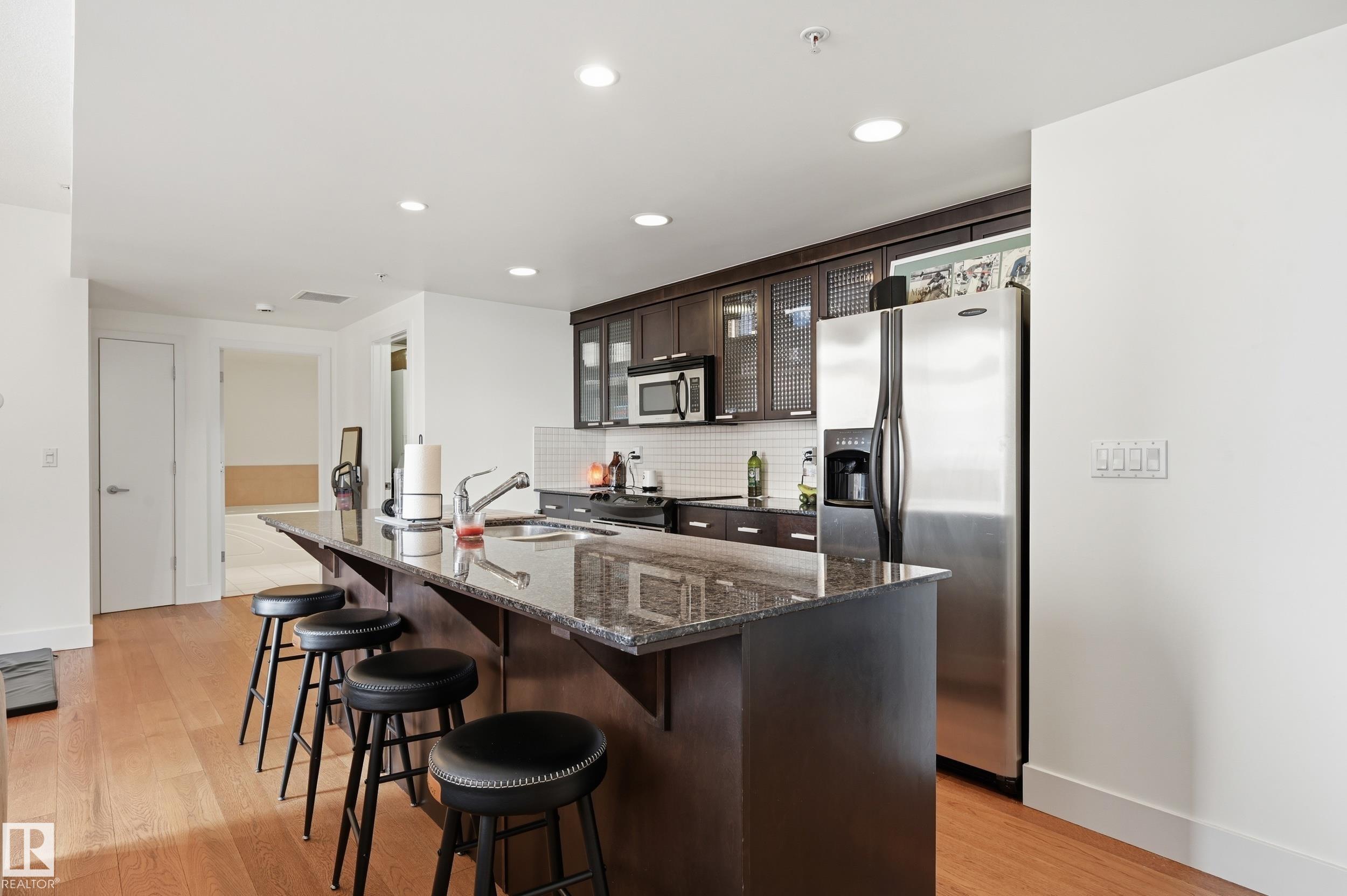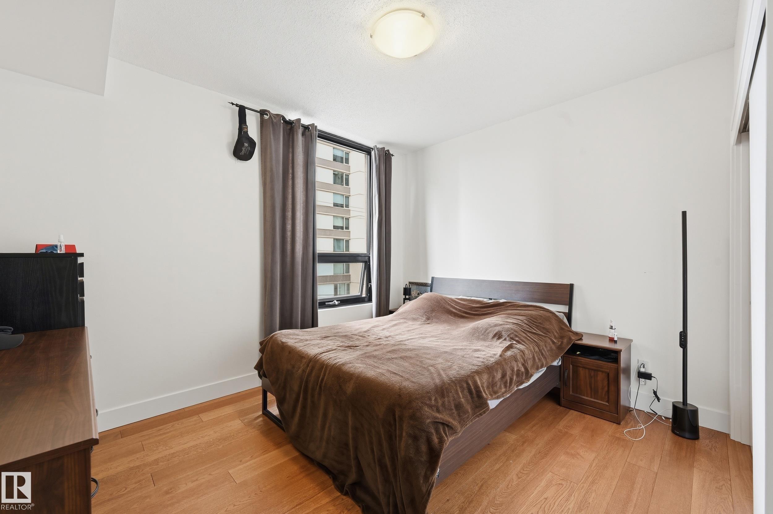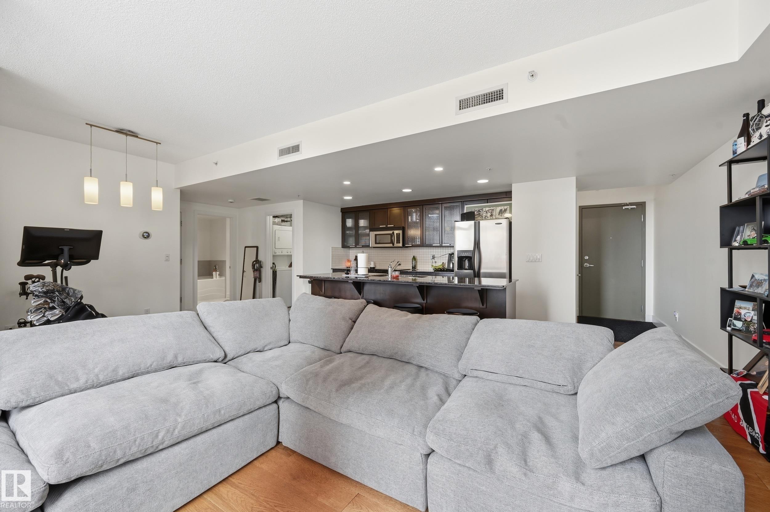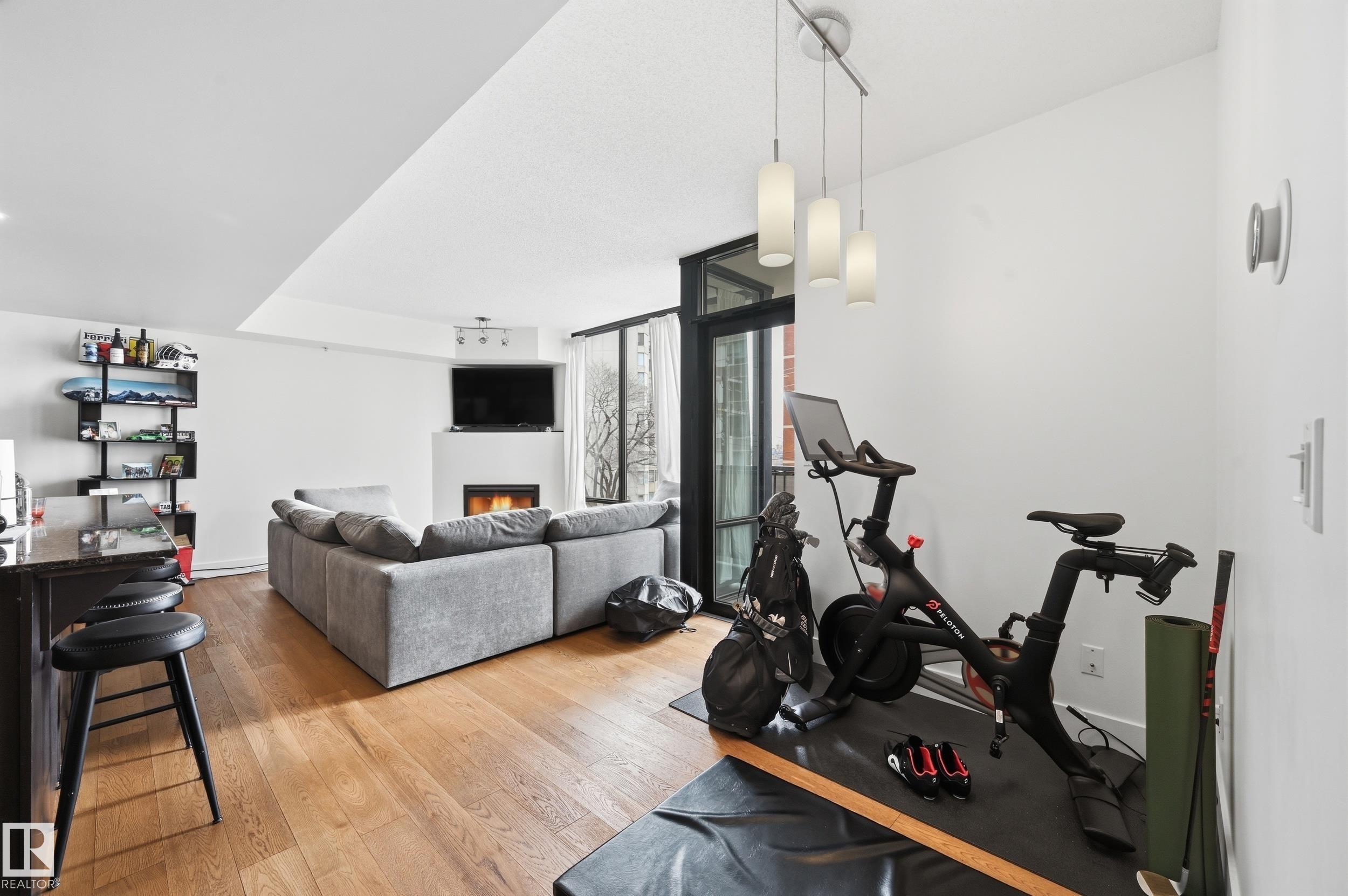 Welcome home to this spacious, luxury condo in the west downtown area. This one bed, one bath suite features floor to ceiling windows on the building's quiet side with river valley views! The spacious kitchen with a huge island, granite counters and stainless steel appliances, ideal for entertaining. Walnut hardwood floors throughout and a gas fireplace in the corner for those cold winter nights. The bathroom is huge with a large soaker tub, separate shower and private water closet. Primary bedroom is big enough to handle your king sized bed plus night stands. Some of the perks include a guest suite, underground parking for yourself and visitors and a car wash. Great patio to soak up those summer rays too. Great dining options within a couple of blocks. You're one block from jogging the river valley trails and if you work downtown you can walk to work. This is a must see for the first time buyer who wants to be in the heart of the action or if you're downsizing.