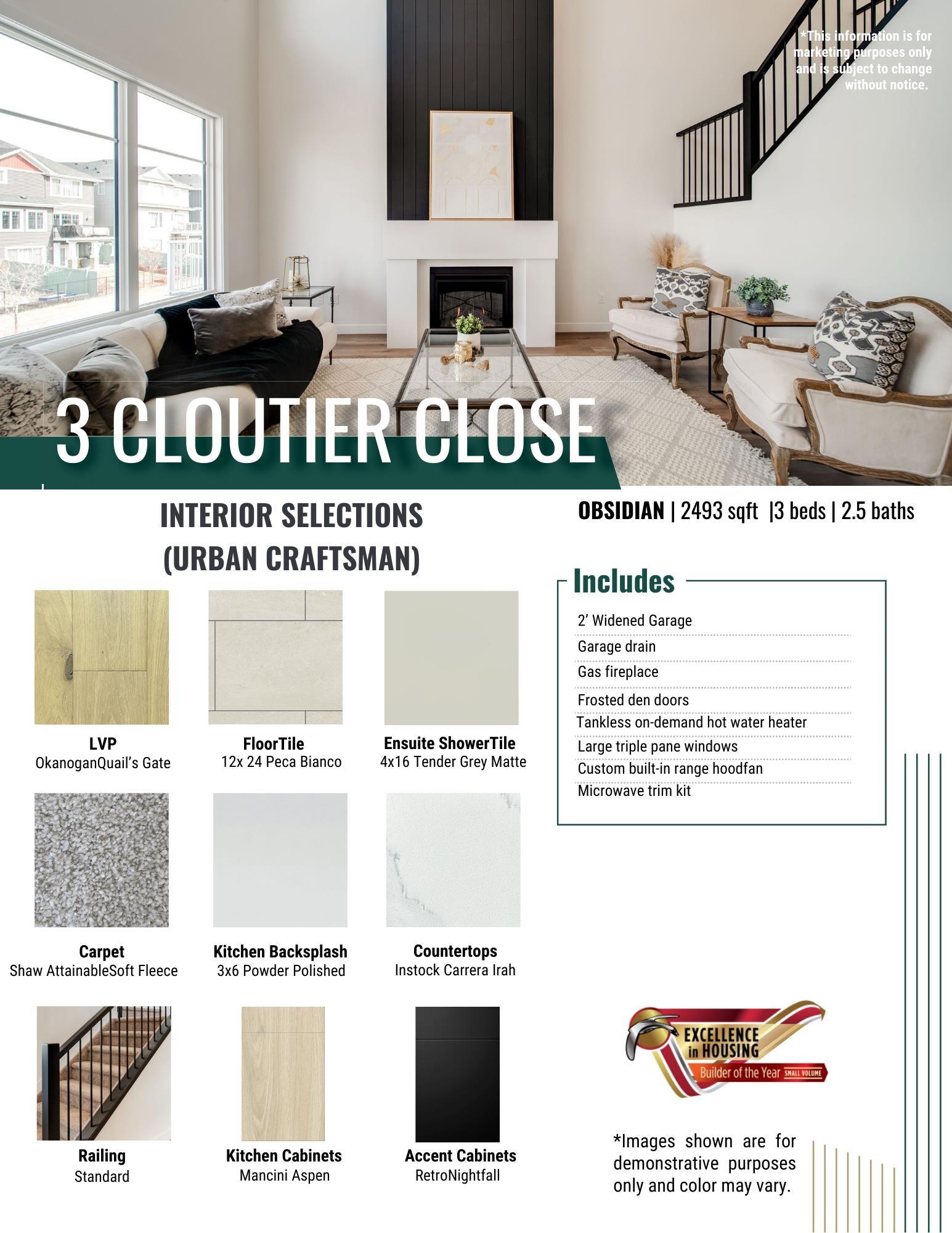 Welcome to the OBSIDIAN model by award winning builder Justin Gray Homes! This model designed in the professionally curated Urban Craftsman colour palette is sure to impress! With just under 2500sqft of living space, this home is the perfect place for those with growing families to call home. The main floor presents an open concept living space, featuring a GAS FIREPLACE, a private DEN w/frosted doors, a chef inspired kitchen w/arched walkthrough pantry and a 2pc bathroom. The large triple pane windows provided in this home also guarantee a ton of NATURAL LIGHT in almost every location of this home. Upstairs, you'll find plush carpet throughout your large BONUS room and all 3 bedrooms as well as the ideal upstairs laundry unit added for your convenience. The breathtaking primary suite w/tray ceilings offers a sleek 5piece ensuite alongside a spacious walk-in closet. Situated on a 30' pocket lot in St. Albert's 2025 best new community. *Photos of similar model,finishes/layout may differ*